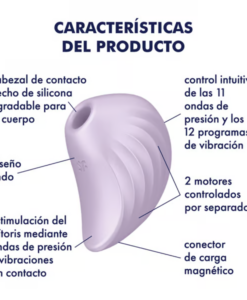 El Satisfyer Pearl Diver mima el clítoris con dos motores controlables por separado y ondas de presión y vibración. El cabezal de fijación del vibrador se ajusta perfectamente al clítoris y está hecho de silicona inocua, higiénica y suave con la piel. Puedes elegir entre 11 programas de onda de presión y 12 de vibración que se pueden combinar entre sí cumpliendo todos tus deseos.